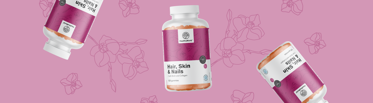 Τα Hair, Skin & Nails είναι ζελεδάκια που περιέχουν 3 βιταμίνες και κολλαγόνο, που φροντίζουν ιδανικά για τα μαλλιά, το δέρμα και τα νύχια και ταυτόχρονα: