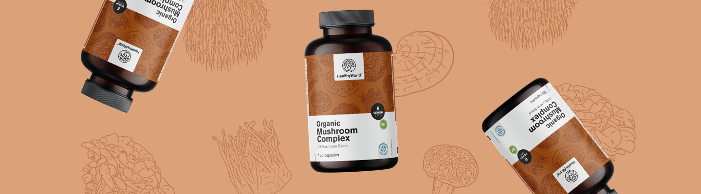 Συστατικά: κέλυφος κάψουλας (HPMC · υδροξυπροπυλομεθυλοκυτταρίνη), χαίτη του λιονταριού* σε σκόνη (Hericium erinaceus, άσκομα), reishi* σε σκόνη (Ganoderma lucidum, μύκητες), chaga* σε σκόνη (Inonotus obliquus, άσκομα), cordyceps* σε σκόνη (Cordyceps sinensis, μύκητες), maitake* σε σκόνη (Grifola frondosa, άσκομα), πλευρώτους ο στρειδοειδής* σε σκόνη (Pleurotus ostreatus, μύκητες), shiitake* σε σκόνη (Lentinula edodes, άσκομα), μανιτάρι σπαραγγιού* (Coprinus comatus, άσκομα) σε σκόνη, κουρκούμας* σε σκόνη (Curcuma longa ), τζίντζερ * σε σκόνη (Zingiber officinale ). *Από πιστοποιημένη βιολογική καλλιέργεια. Η διανομή ελέγχεται από το SI-EKO-002. Γεωργία εκτός ΕΕ.
